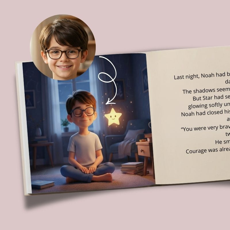 Their real face integrated into every illustration. Not just a name written in — they are the hero of the story.